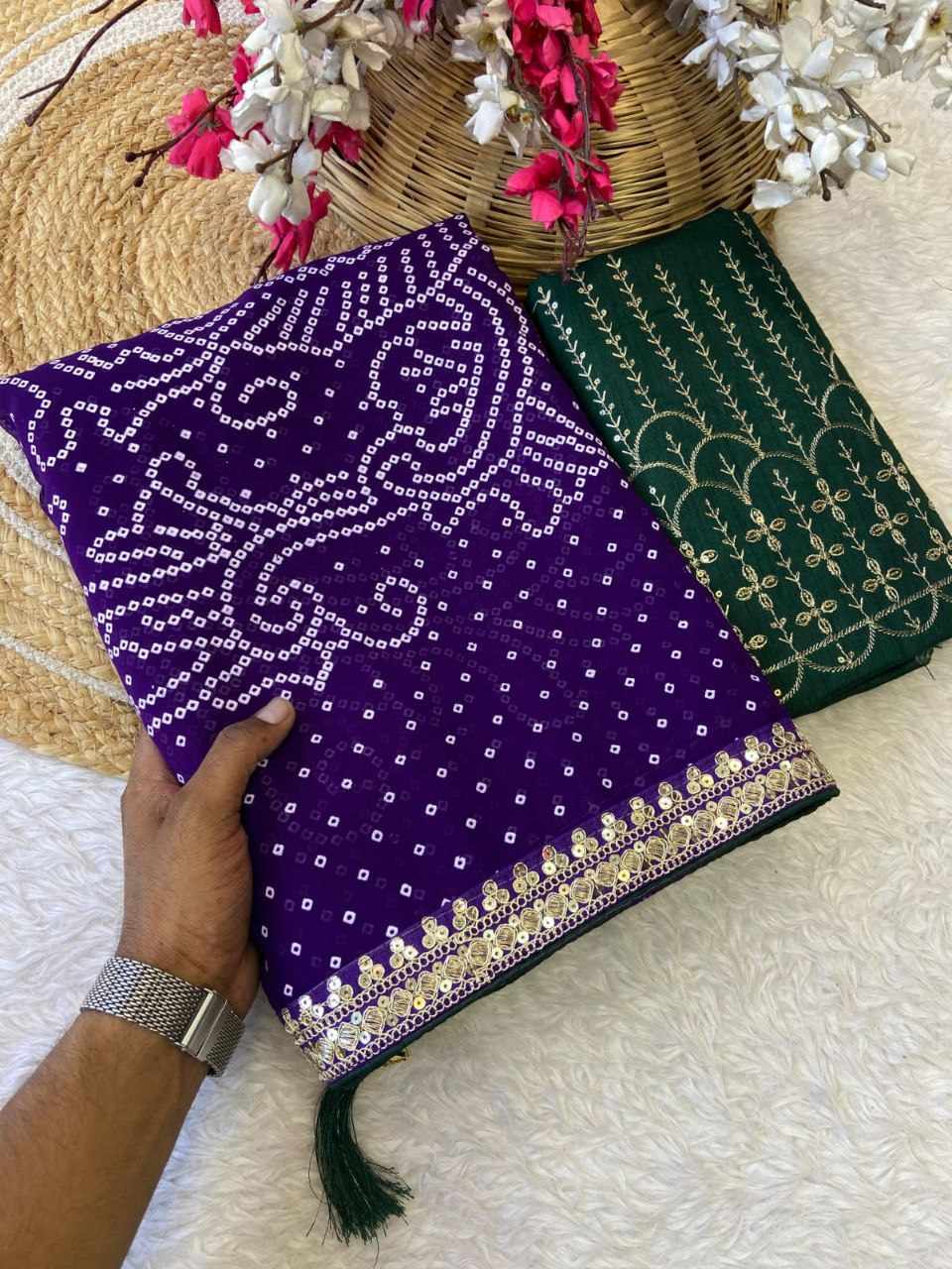 RC Purple Bandhej Georgette heavy Coding Sequence border Saree